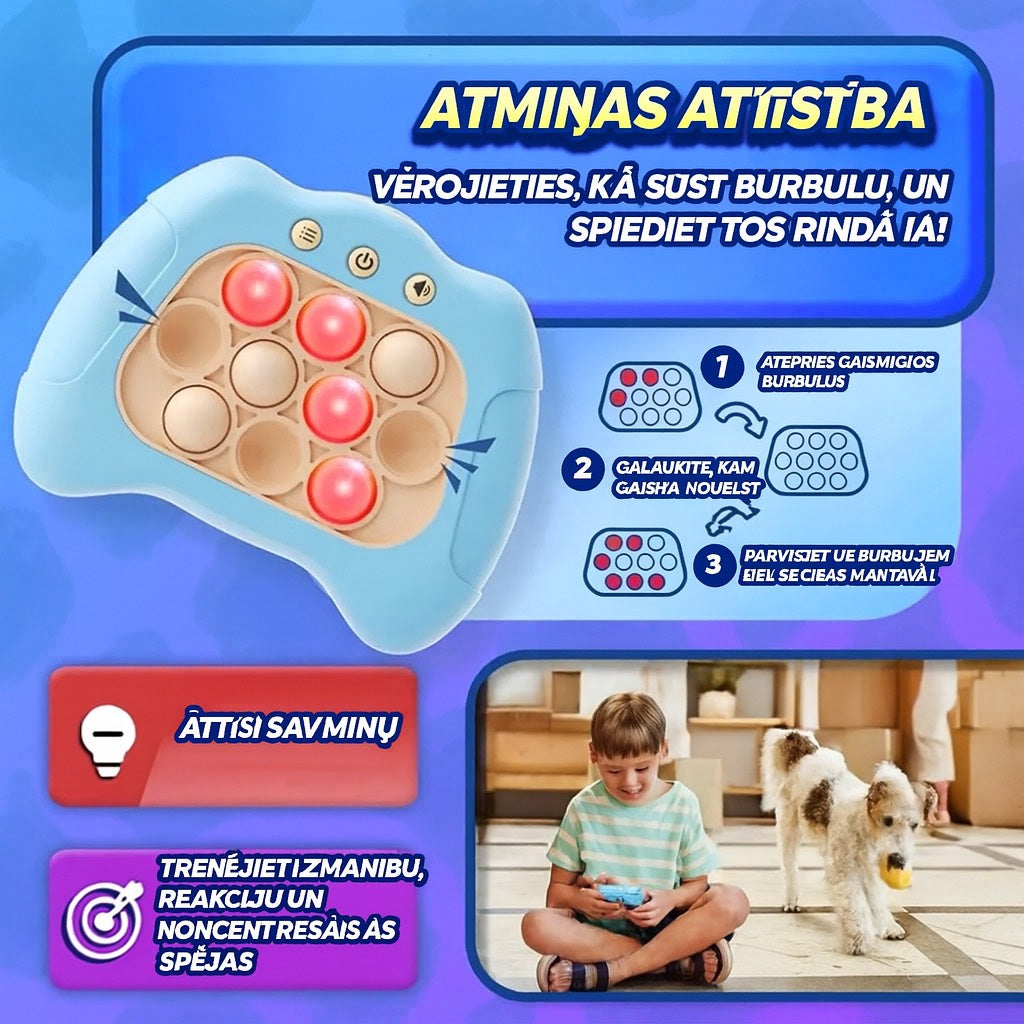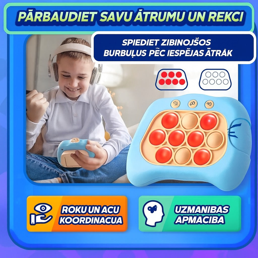 - Unikālā elektroniskā spēle Bubble Pop sniedz bērniem īpašu aizrautību, vienlaikus attīstot roku un acu koordināciju, kā arī reakcijas ātrumu.