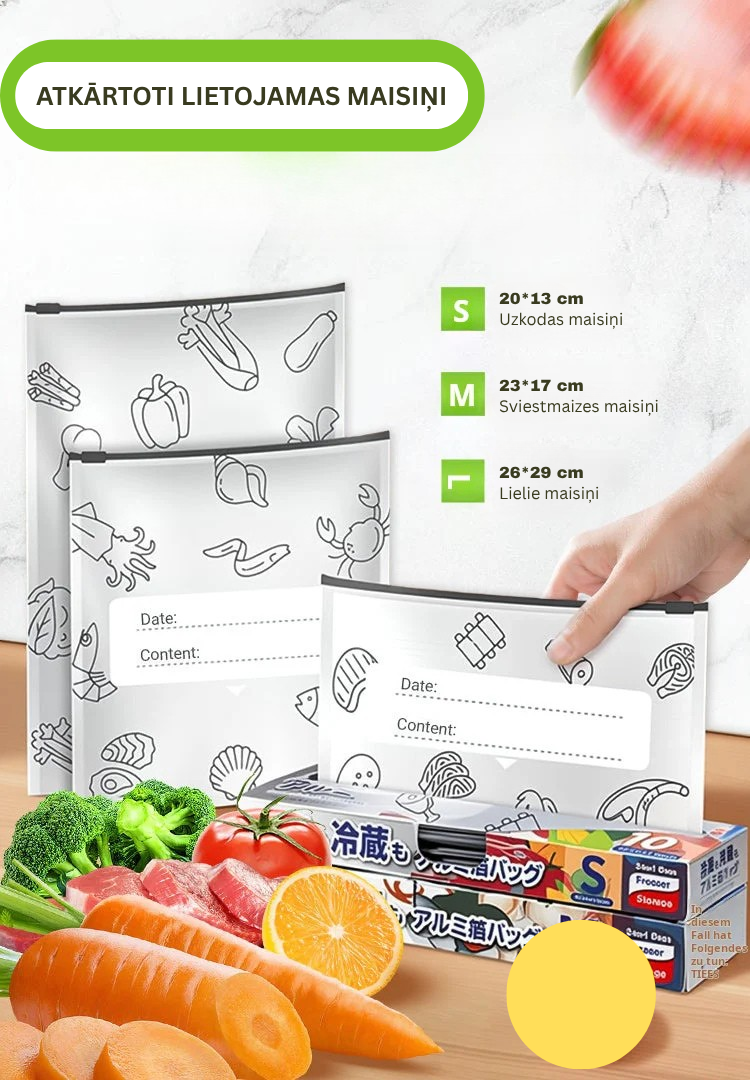 Mūsu atkārtoti lietojamie maisiņi ar aizdari ir lielisks risinājums, kas palīdzēs saglabāt pārtikas svaigumu ilgāku laiku un samazināt atkritumu daudzumu!