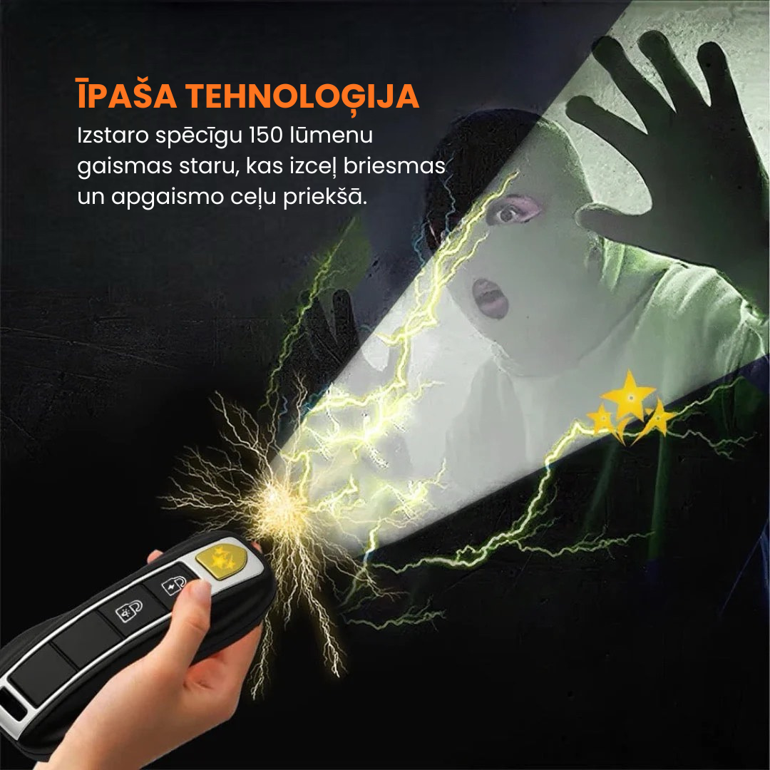 Pasaule, kurā drošība nekad nav garantēta, automašīnas atslēgas formas pašaizsardzības lukturītis sniedz mieru kabatas izmēra formātā. Ar 57 miljonu voltu trieciena jaudu un 150 lūmenu lukturīša gaismu jums vienmēr būs uzticams līdzeklis novērst draudus un vienlaikus nepievērst sev uzmanību.