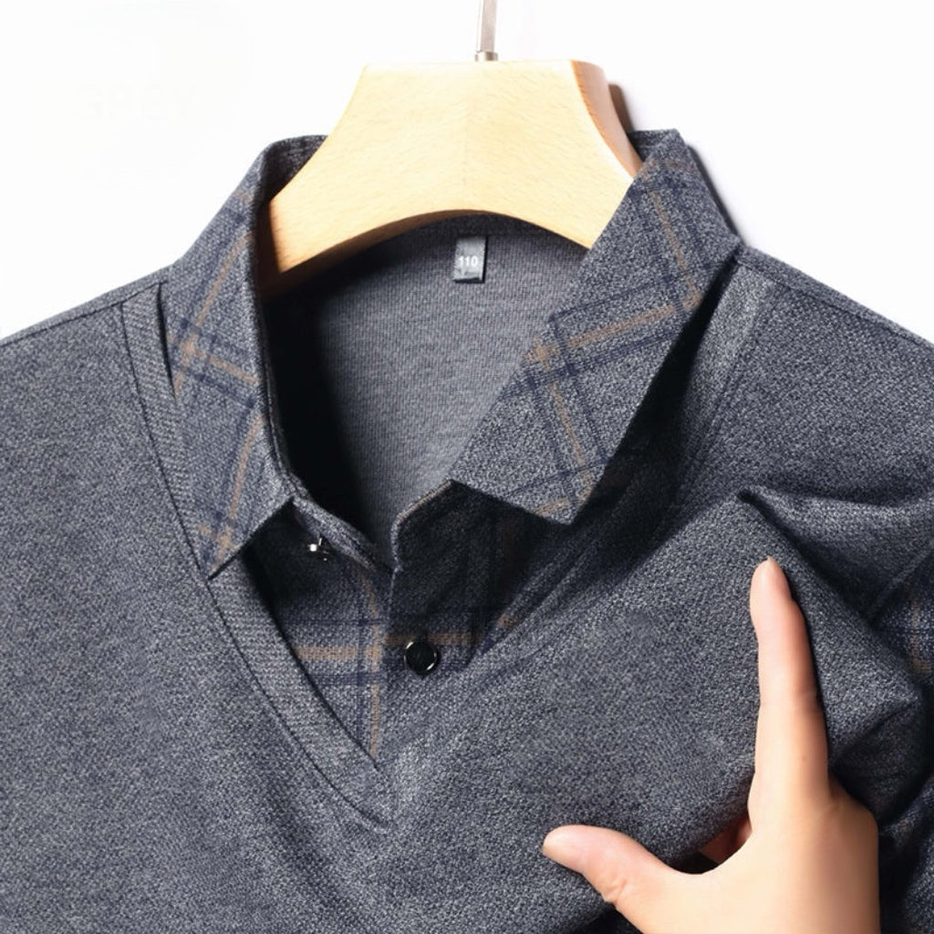 VILTUS DIVDAĻĪGS STILS: Šim garo piedurkņu topam ir inovatīvs viltus divdaļīgs dizains, kas imitē krekla un vestes slāņaino izskatu. Viegli rada brīvu, bet stilīgu tēlu – obligāts apģērbs katram vīrietim.